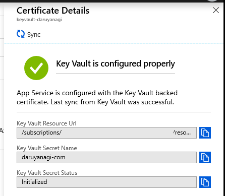 ちなみに App Service Certificate を使って証明書を発行すると Key Vault が作られ、そこに証明書が安全に格納されるようになっています。こっちは自動的に新しい証明書が発行された場合には反映されます。