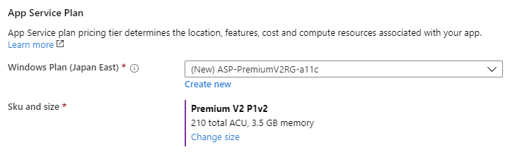 App Service Plan はいくつも Tier があって最初は悩むかもしれませんが、最低でも Premium V2 の P1v2 を選んでおきましょう。Premium V2 はコストとパフォーマンスのバランスが取れています。